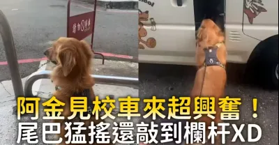 黃金獵犬見校車來超興奮!尾巴猛搖還敲到欄杆XD