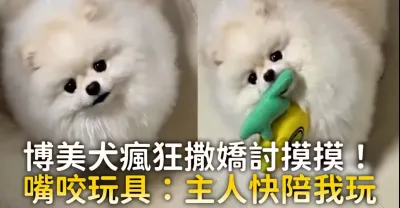 博美犬瘋狂撒嬌討摸摸!嘴咬玩具:主人快陪我玩