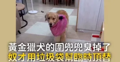 黃金獵犬的圍兜兜臭掉了 奴才用垃圾袋幫臨時頂替