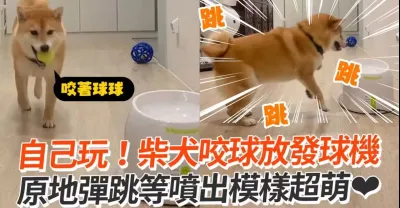 自己玩!柴犬咬球放發球機 原地彈跳等噴出模樣超萌❤