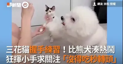 三花貓握手練習!比熊犬湊熱鬧 狂揮小手求關注「沒得吃秒轉頭」