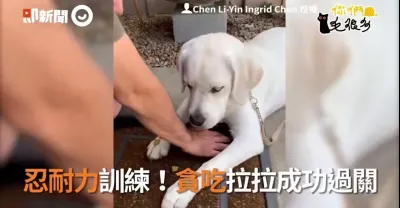 拉布拉多的忍耐力訓練!零食放手上...白拉拉低頭定格:我不動