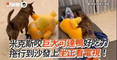 米克斯咬巨大可達鴨好吃力 拖行到沙發上坐正看電視!