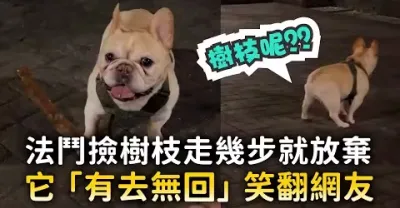 法斗撿樹枝走幾步就放棄 它「有去無回」笑翻網友
