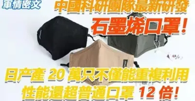 中國科研團隊最新研發石墨烯口罩,日產產20萬只不僅能重複利用 性能還超普通口罩12倍!