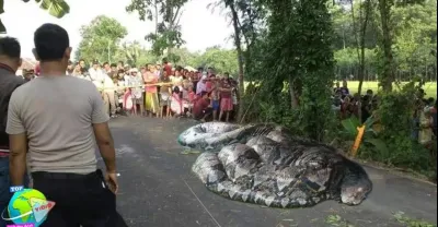 巴厘島登巴薩的居民對路邊出現的一條巨蟒感到震驚