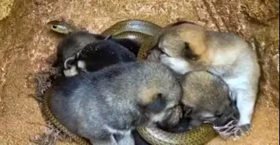 5隻小狗崽流浪山洞,不料被蛇死死纏住身體,命懸一線幸得相救!