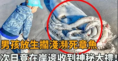 章魚擱淺十小時險被曬死!男孩將其放回海中,次日竟在海岸收到神秘大禮...