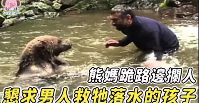 熊媽媽跪在路邊,懇求男人救牠落水的孩子...
