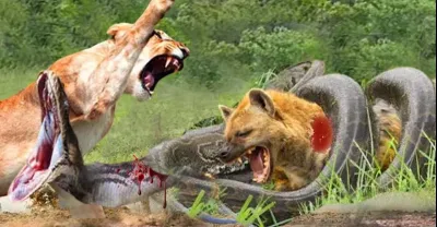 Fierce Fight _ Python Vs Hyena, Lion _ Lion Rushes To Attack Python To Rescue Hyena From Death