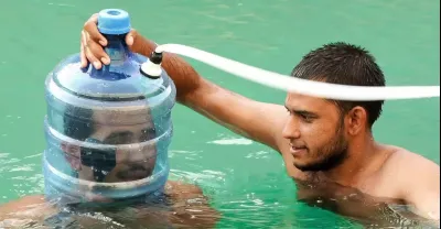 這印度男子居然用水桶做成氧氣罩!想測試能在水裡潛多久?不怕憋出內傷嗎?
