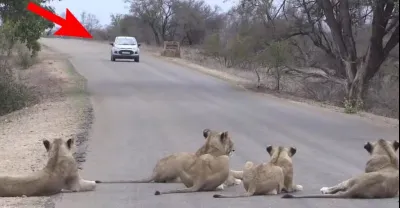 男子開車自駕遊途中,突然馬路上出現十多頭獅子攔住不讓過!喇叭都不敢按