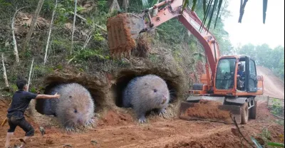 使用挖掘機挖孔捕捉 2 森林老鼠,大型挖掘機工作遇見森林老鼠