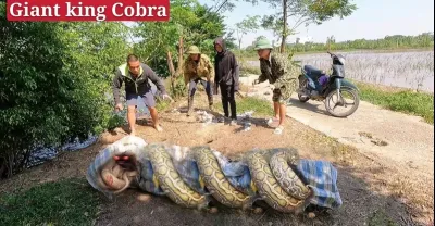 看到世界上最大的眼鏡王蛇爬上街,村民們嚇壞了