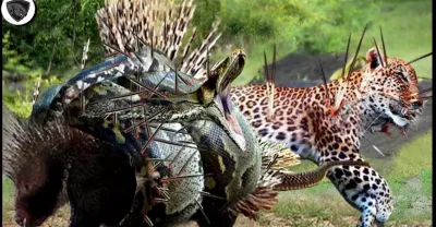 刺蝟瘋狂攻擊每一個擋道的動物►►豪豬vs豹,蟒蛇,獅子