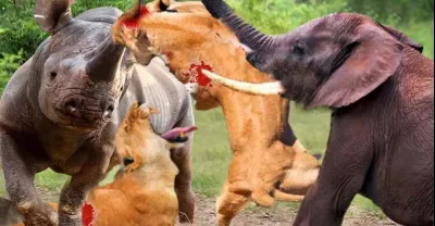 Rhino Launched A Powerful Butt At The Weak Point Of Lion And Attacked Elephant To Gain Prey