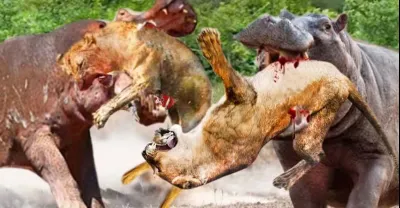 Hippo Vs Lion ► Hippo Counterattacks Lion ► Wide Mouth Hippopotamus Tortured Madly Lion To Revenge