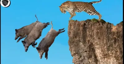 Hungry Leopard Risked Their Lives To Jump Into Abyss To Destroy Wild Boar