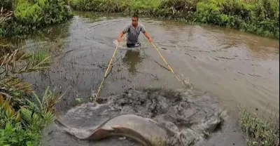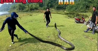一個小女孩獨自在河上抓到一條20公斤的巨型眼鏡王蛇