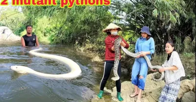在河裡救出被兩條白化蟒蛇襲擊的3個美女我女孩抓蛇