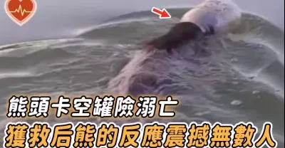 棕熊頭卡空罐不慎墜湖,絕望之際好心男子奮力搶救,獲救後熊的反應震撼無數人!