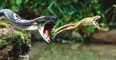 看蛇是如何捕獵青蛙的,一口一隻,都不帶嚼的
