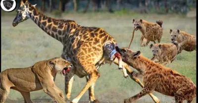 사자와 하이에나가 결합하여 아기 기린을 공격하는 방법을 찾습니다.