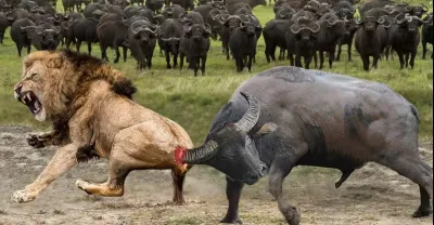 憤怒的水牛媽媽為了拯救她的小牛,在獅子群前打倒獅子 - 水牛與獅子