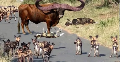 BÚFALO É CERCADO POR CÃES SELVAGENS E SE DÁ MAL