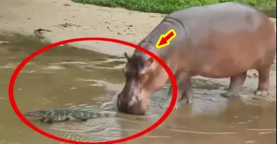河馬對巨蜥虎視眈眈,多次試圖咬巨蜥尾巴,嚇得巨蜥快速爬走!