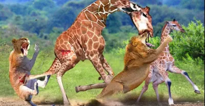 激戰!兇猛的長頸鹿媽媽咬下獅子的頭來拯救她的小牛 - 長頸鹿大戰獅子