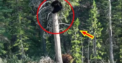 實拍!灰熊VS黑熊!灰熊瘋狂追捕黑熊,嚇得黑熊爬上樹躲避,在樹上待了好幾小時才敢下樹逃跑!