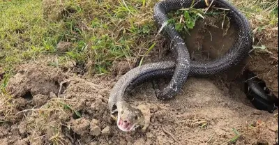 父子看到一條300公斤重的巨蛇爬過森林,驚慌逃跑