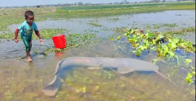 聰明的男孩在泥水中用手抓魚 - 驚人的手釣視頻