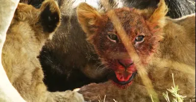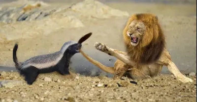 獅子被獾咬了一口,大叫起來。一隻無畏的蜜獾攻擊獅子。