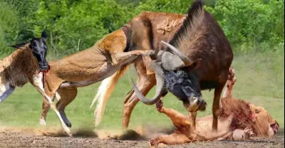 Incredible! Brave Wildebeest Fight To Save Calves From Bloodthirsty Predators From Wild Dogs, Lions