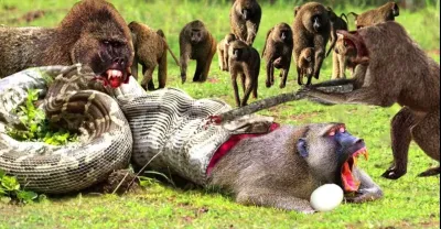 Dire! Baboons Fight Frenzy To Save His Teammates From Death From The Mouth Of The Giant Python