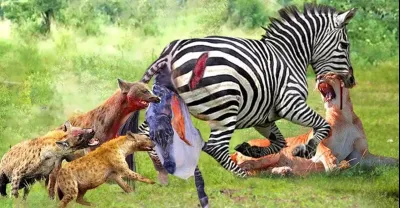 多麼美妙!斑馬媽媽勇敢地保護她的孩子免受鬣狗和獅子的野蠻襲擊