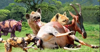 Wild Dog And Hyena Fight For Prey And Topi Has A Chance To Escape In 10 Seconds