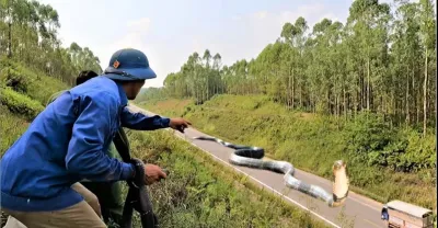Terrifying moment of two men when they saw the giant king cobra crossing the road.