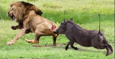 太勇敢了!強大的疣豬媽媽來拯救逃離獅子的可憐的疣豬寶寶 - 鷹與山羊