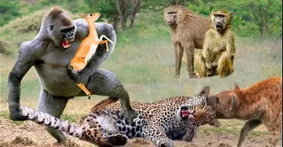 令人驚嘆的...大猩猩群擊落豹拯救黑斑羚 - 豹與狒狒、鬣狗、黑斑羚