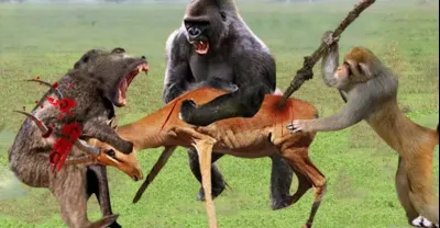 狒狒家族在為美味佳餚擊敗黑斑羚後感到滿意