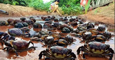 哇!!一個聰明的男孩在家裡附近的地下石頭上抓到很多螃蟹,真是太棒了,快樂的一天