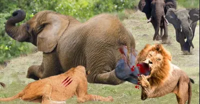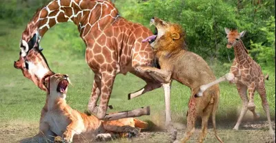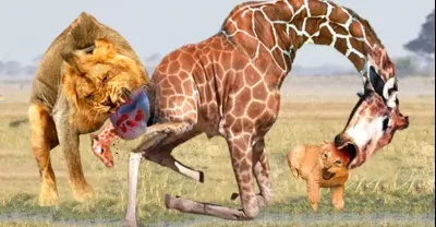 長頸鹿用她所有的力量保護她的孩子免受邪惡獅子的傷害