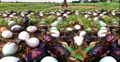 哇!!天哪,真是個聰明的男孩,在稻田裡抓了很多蟹和鴨蛋,在路邊度過了愉快的一天