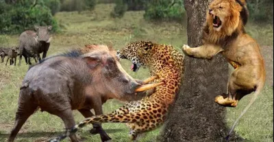 奇怪...母獅咬豹頭拯救疣豬 - 疣豬與豹、鬣狗、獅子