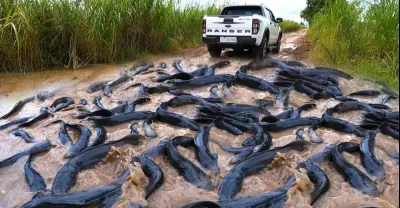Wow! a lots of fish on road in flooding meet ford ranger at field catch by best hand
