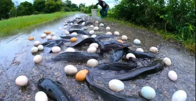 頂級獨特的釣魚!很多人抓鯰魚和撿蛋鴨在路上用手淹水