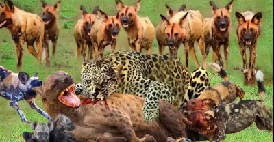 痛苦的鬣狗被野狗殘忍地襲擊,偷走了它的獵物,牟取暴利的是豹!
